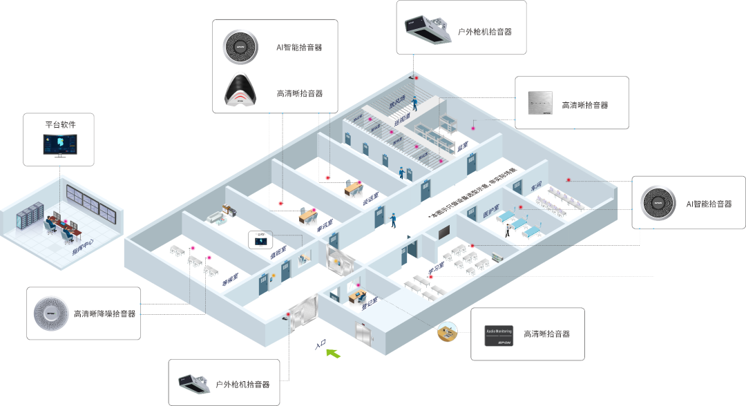關(guān)于拾音器的設(shè)計(jì)部署指揮中心:在指揮中心部署后臺(tái)管理軟件,可以對(duì)接入的拾音設(shè)備進(jìn)行狀態(tài)監(jiān)視、故障報(bào)警、軟件升級(jí)和相關(guān)性能參數(shù)調(diào)整,便于隨時(shí)掌握拾音設(shè)備運(yùn)行狀態(tài)。監(jiān)室/禁閉室/等候室:監(jiān)室、禁閉室、監(jiān)獄醫(yī)院、室內(nèi)公共區(qū)域等場(chǎng)景,建議在此多點(diǎn)位部署拾音器,確保做到全天時(shí)無死角監(jiān)聽。在側(cè)墻處、天花板處安裝具備防破壞性、隱蔽性高、抗混響設(shè)備。審訊室/談話室/會(huì)見室:在審訊室、談話室、會(huì)見室等近距離桌面拾音環(huán)境,推薦在桌面部署桌面型拾音器可以有效拾取雙方近距離音源屏蔽其它音源干擾,聲音更清晰;再部署一個(gè)環(huán)境型拾音器對(duì)全室聲音進(jìn)行拾取。拾音器通過與攝像頭聯(lián)動(dòng),同步錄音錄像,確保審訊/談話/會(huì)見時(shí)的錄像錄音備份公正。周界/武警崗?fù)?AB門/放風(fēng)場(chǎng):室外區(qū)域具有環(huán)境噪聲大、人員聚集多、晝夜溫差大、環(huán)境惡劣等特點(diǎn),對(duì)于此處需要高清拾音,但傳統(tǒng)拾音器普遍效果較差無法達(dá)到理想效果。通過部署槍擊型拾音器對(duì)室外周邊區(qū)域位置進(jìn)行聲音監(jiān)控。降低后期維護(hù)成本,提高工作效率。有效預(yù)防突發(fā)事件,做到事前預(yù)防、事中控制有效、事后處理規(guī)范。