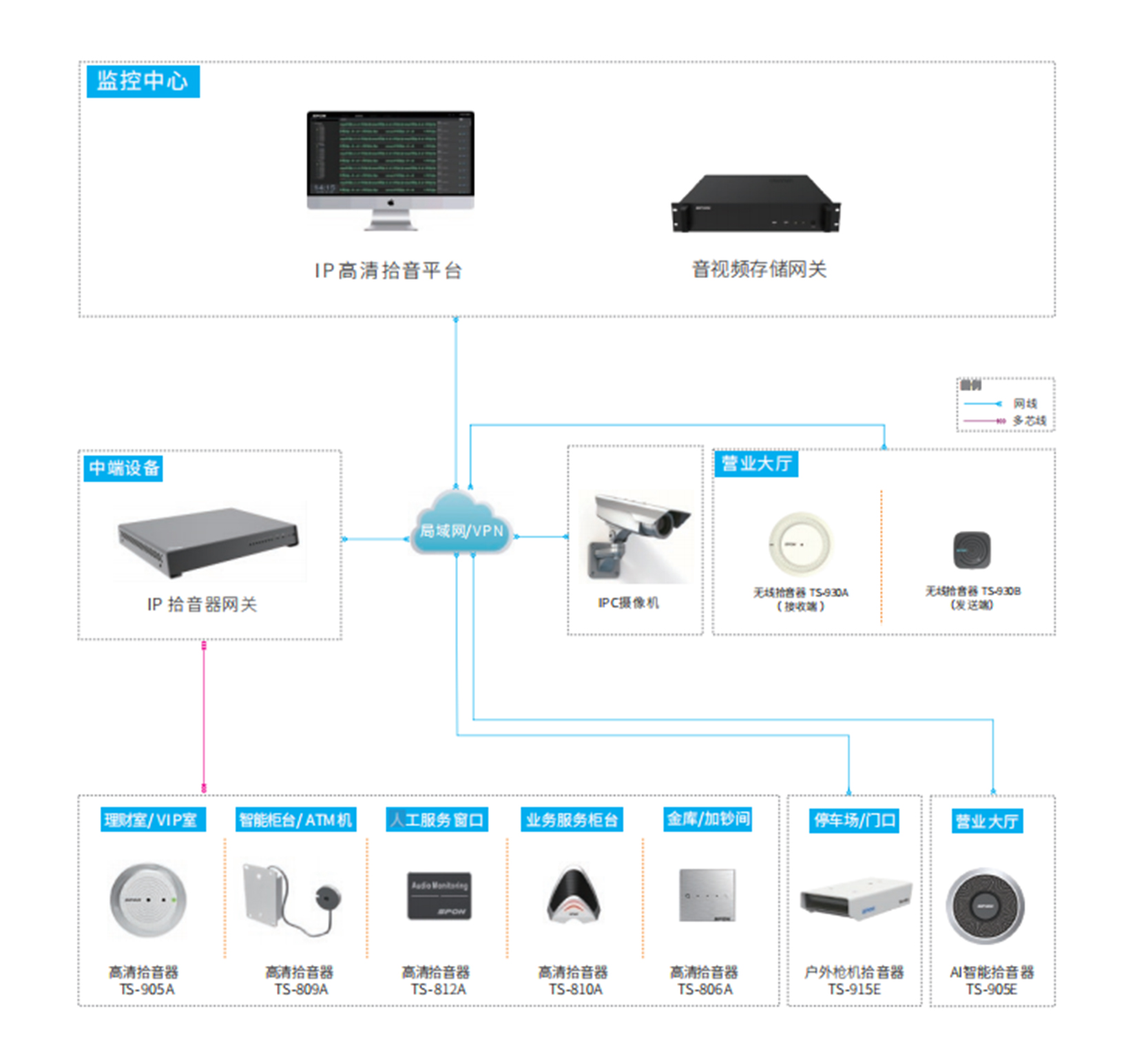 營業(yè)網(wǎng)點(diǎn)部署的拾音器設(shè)備能直接與視頻監(jiān)控設(shè)備結(jié)合做到音視頻同步監(jiān)控,實(shí)現(xiàn)聲音與視頻復(fù)核功能,當(dāng)有意外事件發(fā)生時(shí),可以為日后處理事件取證時(shí)提供客觀可靠的音視頻依據(jù)。