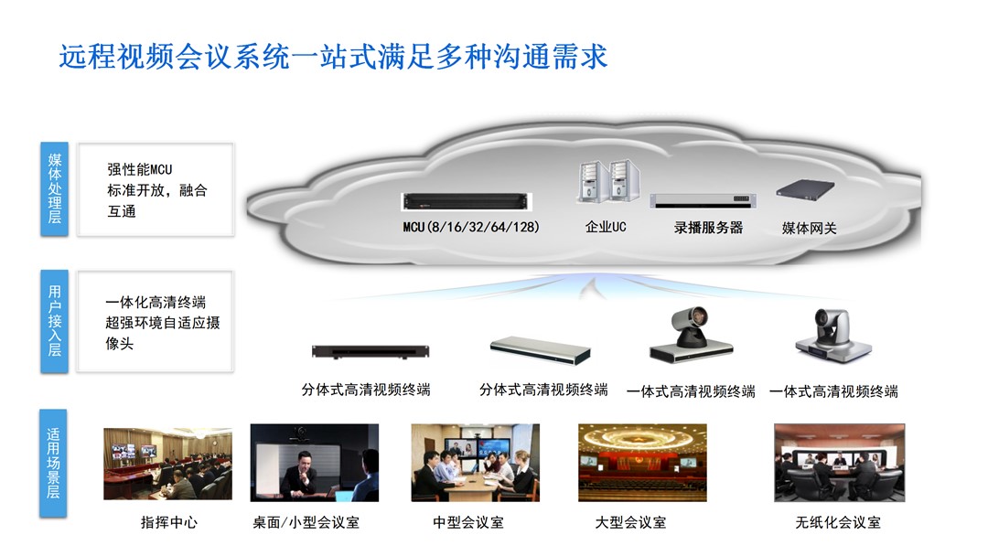 2. 音視頻設備:包括智能攝像頭、麥克風陣列和專業(yè)揚聲器,保證遠程會議的音視頻質量,提供清晰的視聽體驗。