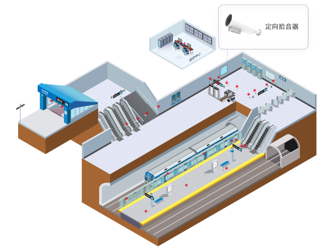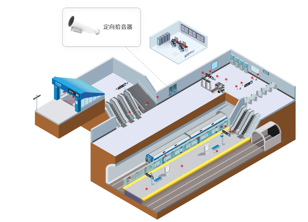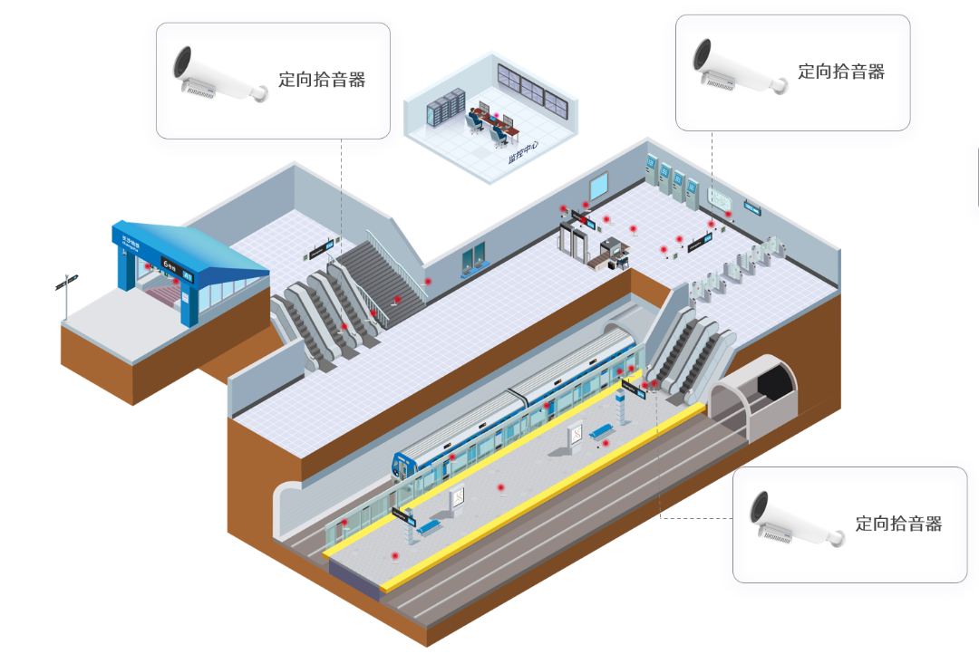 部署方案:通過部署定向型拾音器對主要通道進行聲音監(jiān)控,為事件發(fā)生原因、聚集討論目的、司乘人員糾紛提供依據降低后期維護成本,提高工作效率。有效預防突發(fā)事件,做到事前預防、事中控制有效、事后處理規(guī)范。