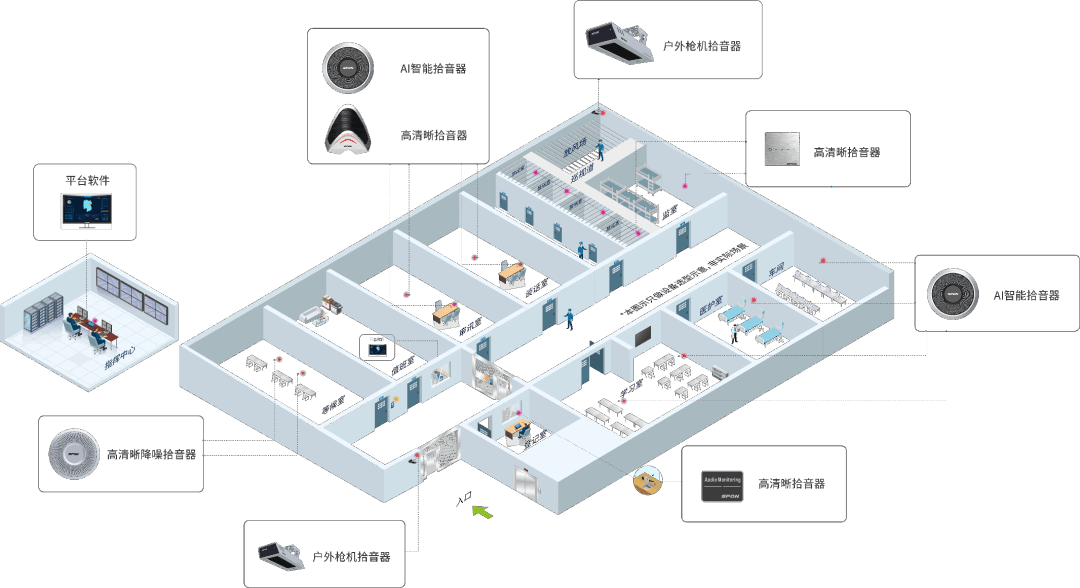 建議在監(jiān)室、車間、學(xué)習(xí)室等重要區(qū)域部署AI型智能網(wǎng)絡(luò)拾音器,可對周邊環(huán)境噪音的干擾濾除、工頻干擾抑制,提升對人和環(huán)境有效聲音的監(jiān)控,提升聲音復(fù)核的語音清晰度。